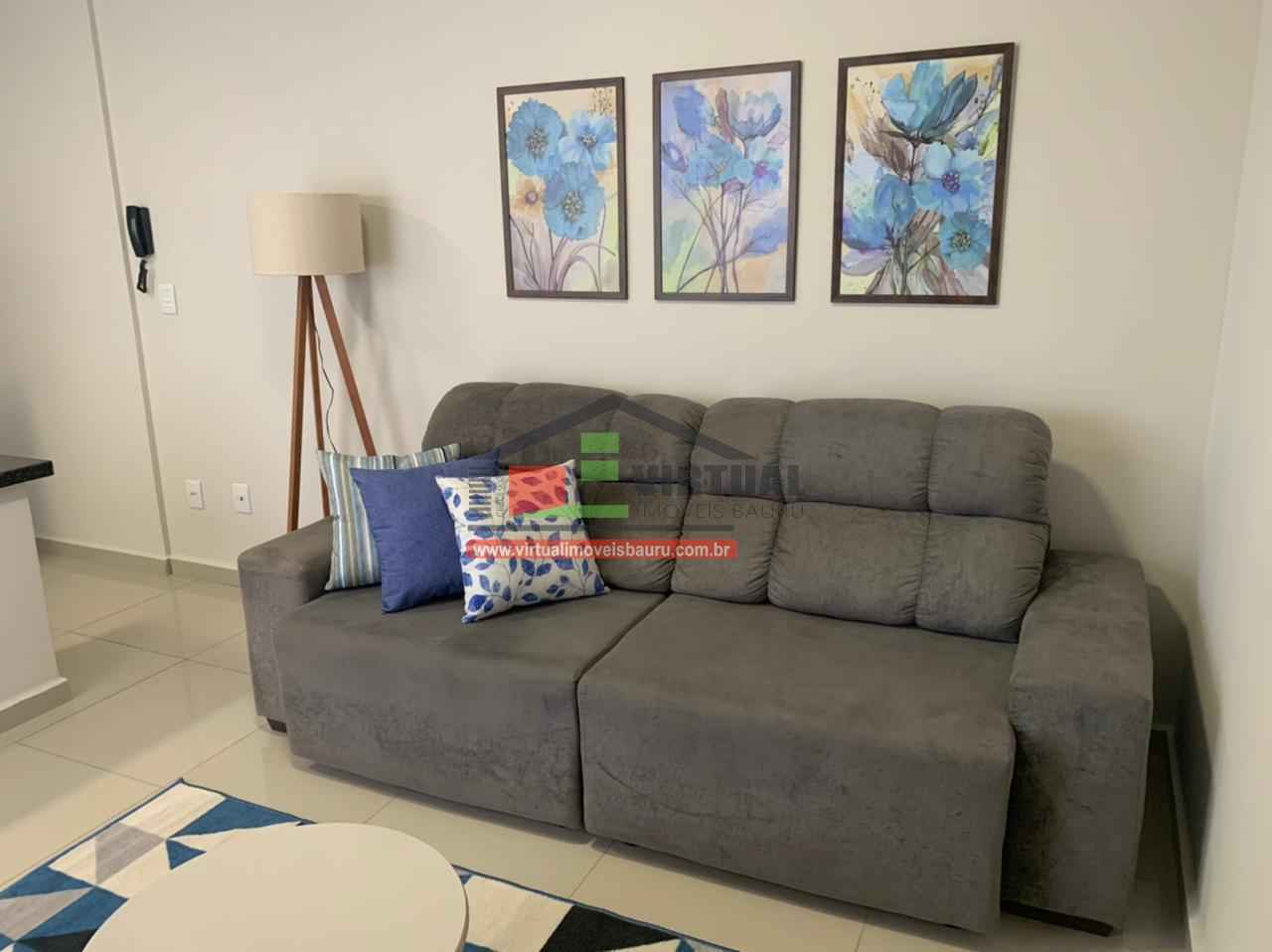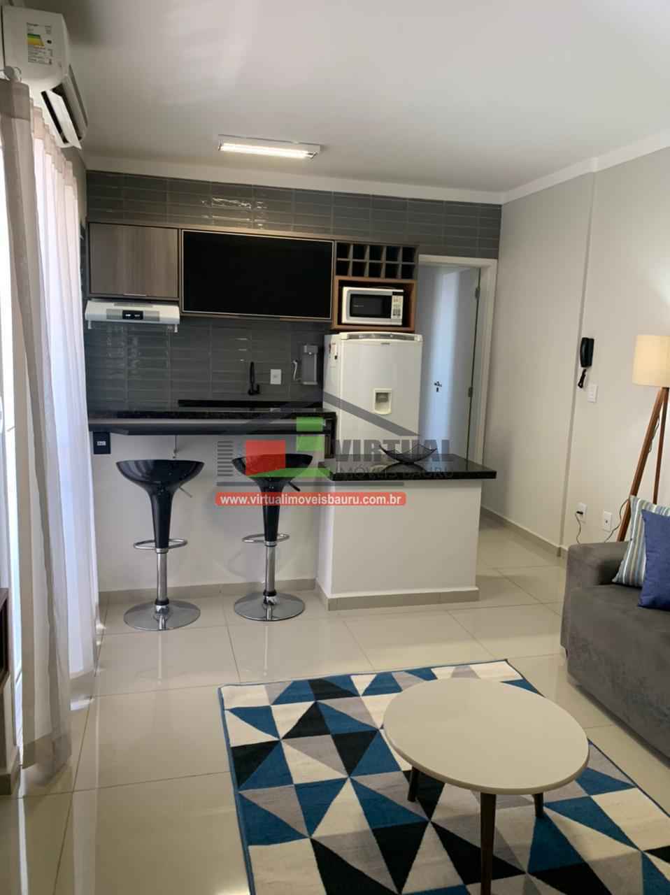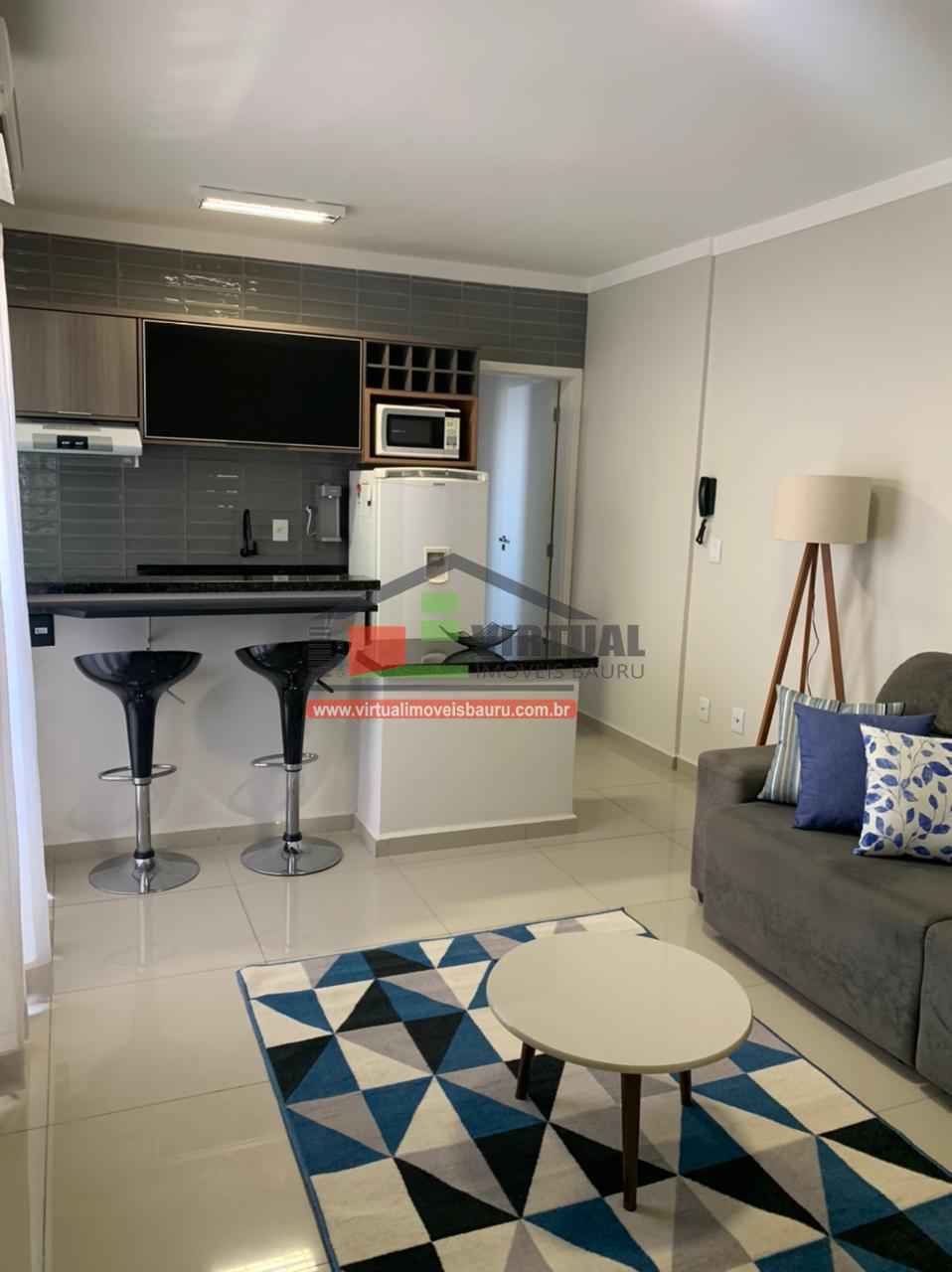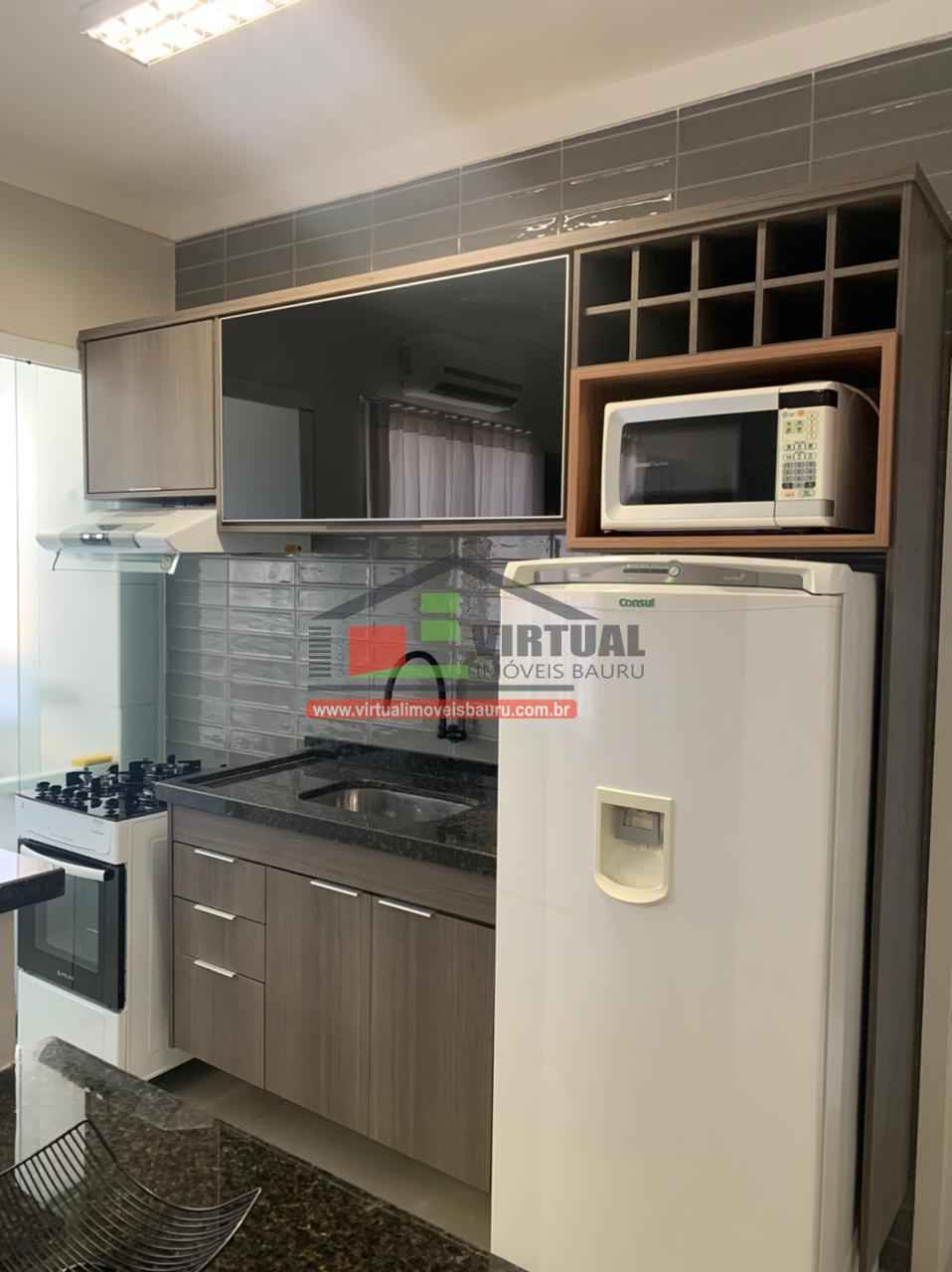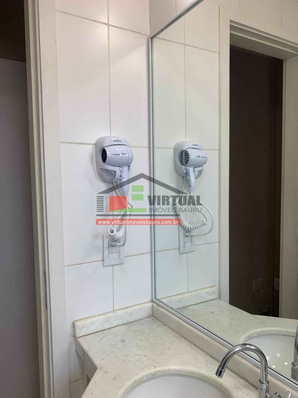 com ar condionado, ventilador de teto, cama, geladeira frost free, microondas, fogão, depurador de ar, máquina lava roupa, chuveiro, secador de cabelos, banquetas, sofá, tapete,